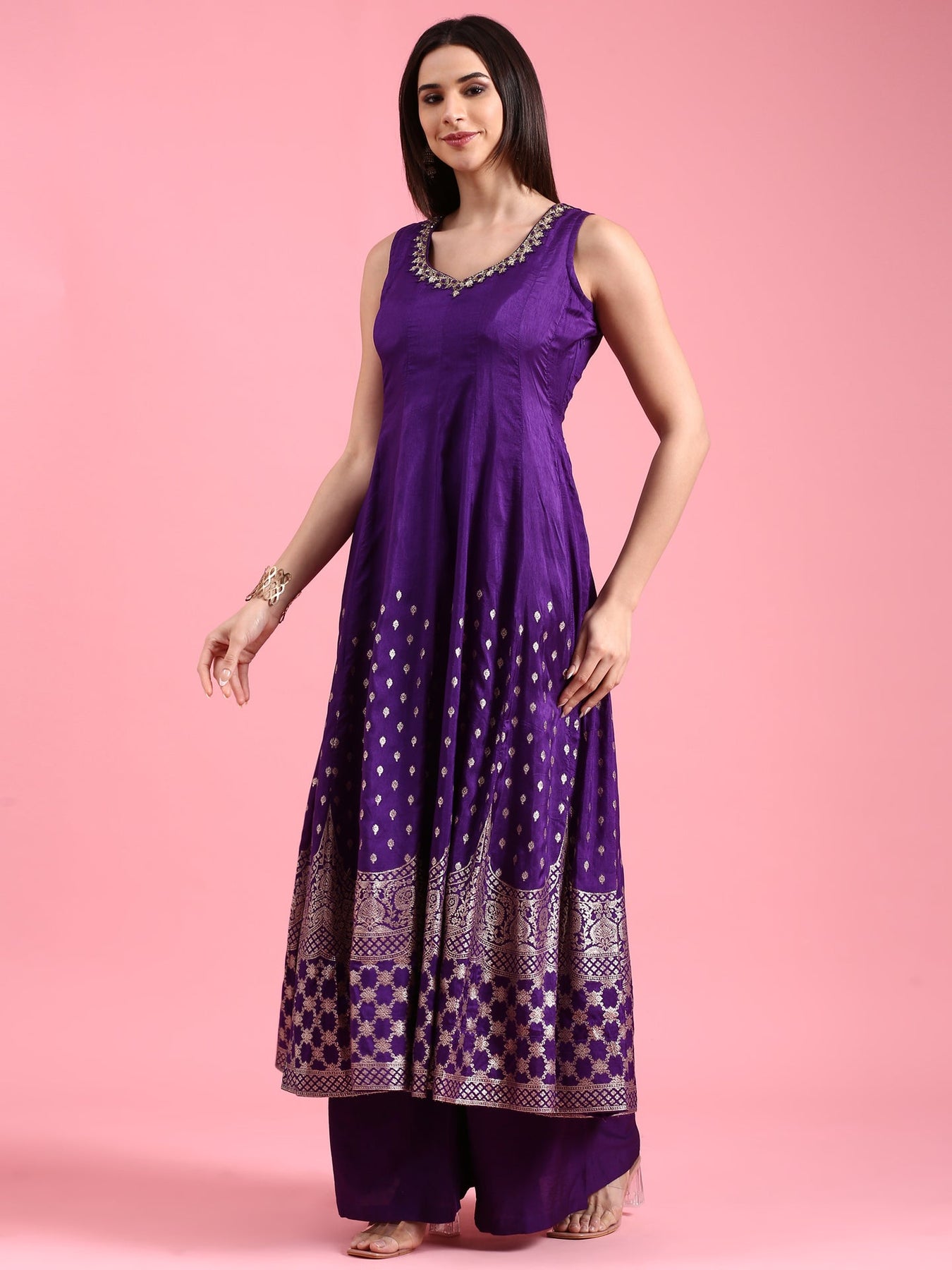 Experience elegance with this Purple Silk Weaving Long Kali paired with matching palazzo pants. The luxurious silk fabric offers a smooth, rich texture that drapes gracefully, enhancing your silhouette. Its intricate weaving highlights craftsmanship, making it perfect for special occasions or festive events. The complementary palazzo ensures comfort without compromising style, allowing effortless movement. This ensemble balances traditional charm with contemporary sophistication, ideal for those who appreciate timeless fashion with a modern touch.