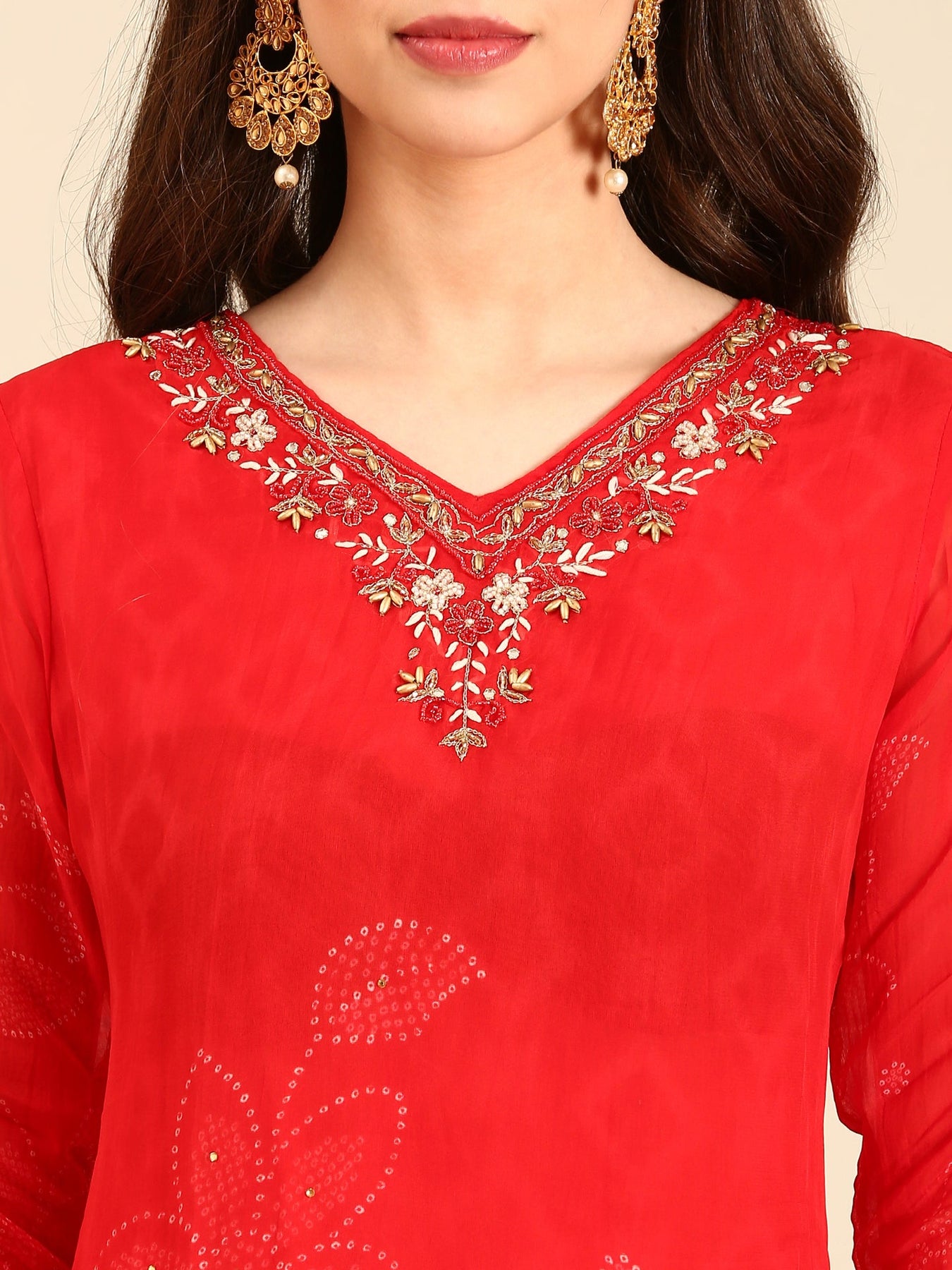 Elevate your wardrobe with this Red Handed Embroidery 3-piece suit set featuring an exquisite organza flower bandhani print. The V-neck design is enhanced with delicate zari embroidery and adorned with intricate kardhana beadwork, blending traditional craftsmanship with modern elegance. Perfect for special occasions, this set offers a refined and graceful silhouette that speaks of timeless sophistication.