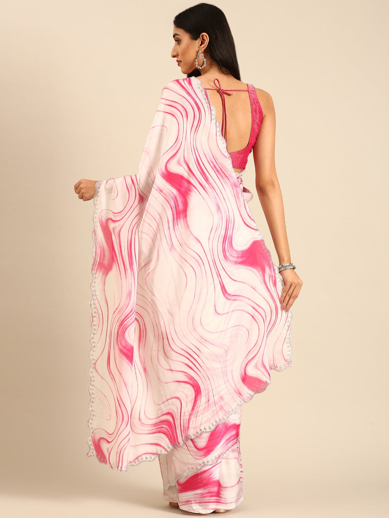 This white and pink satin saree is elegantly adorned with Swarovski crystal embroidery, adding a refined sparkle to its smooth, lustrous fabric. Designed for sophistication, the delicate contrast of pink accents enhances the classic white satin base, making it perfect for formal occasions. The intricate Swarovski detailing not only elevates the saree’s aesthetic but also ensures a luxurious finish that catches light beautifully, creating an exquisite and graceful ensemble.